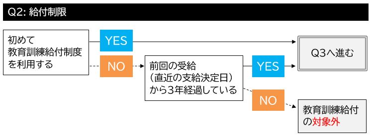 専門実践教育訓練給付金のみの受給の場合、年齢制限、回数制限はありません(給付金額の上限はあります)。ただし、教育訓練給付金を受給したことがある場合は、今回の受講開始日が、前回の教育訓練給付金の支給決定日から3年以上経過していることが必要です。