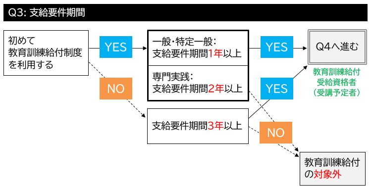 教育訓練の受講開始日までの間に雇用保険に加入していた期間(支給要件期間)が3年以上であることが条件となっています。ただし、2014年(平成26年)10月1日以降に教育訓練給付金を受給したことがなく、初めて専門実践教育訓練給付金を受給する場合、支給要件期間は3年ではなく、2年でよいです。