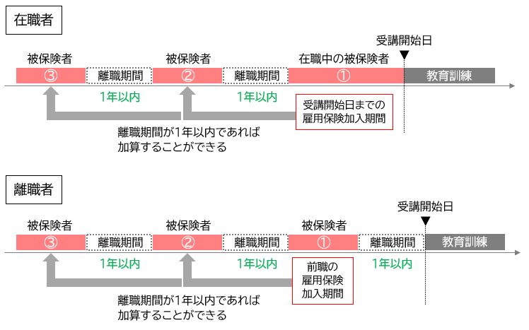 専門実践教育訓練の受講開始日に、雇用保険の被保険者である人(在職者)または被保険者であった人(離職者)に限られます。離職者だけでなく、現在在職している人も対象となります。なお、離職者については、離職の翌日から1年以内(最大20年まで延長できる)に教育訓練を開始する場合に限ります。