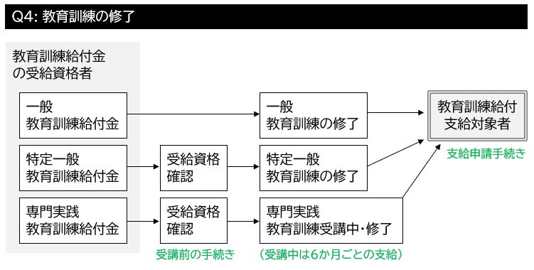教育訓練の受講から給付金の支給までの手続きは、給付金の種類によって異なります。それぞれの手続きの方法について、詳しくはこれらの記事をご覧ください。