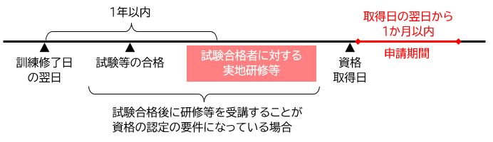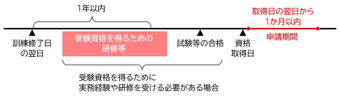 このように、やむを得ない理由により、当該修了した日の翌日から起算して1年以内に当該特定一般教育訓練に係る資格の取得等をすることができない場合は、最短のスケジュールで資格取得等をした日の翌日から起算して1か月以内が支給申請期間となります。