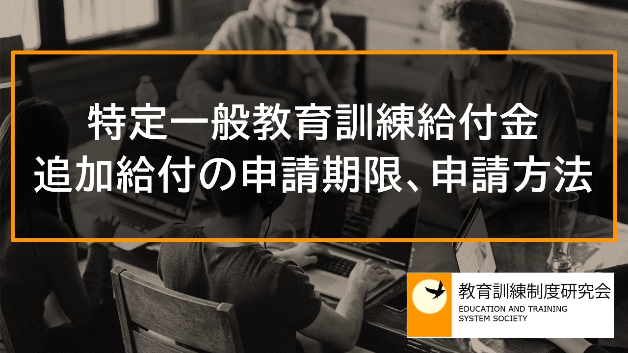 特定一般教育訓練給付金の支給を申請するには、訓練修了日の翌日から起算して1か月以内に、住居所管轄のハローワークに「教育訓練給付金支給申請書」(追加給付用)を提出します。