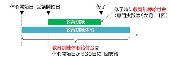 つまり、教育訓練休暇中の30日ごとに1回、教育訓練休暇給付金が支給され、教育訓練修了時に教育訓練給付金が支給されます。両方とも申請すれば受給できます。